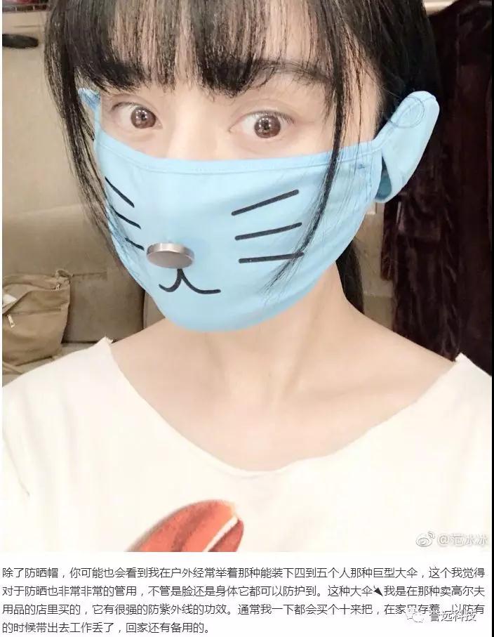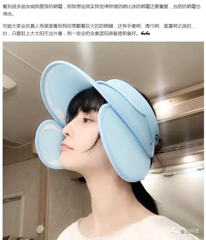 范冰冰说自己不仅在真人秀节目里经常戴着巨大的防晒帽,还有手套、围巾、面罩之类的,只要赶上大太阳天出外景,都一定会把全套遮阳装备提前备好,做一个全副武装星人!