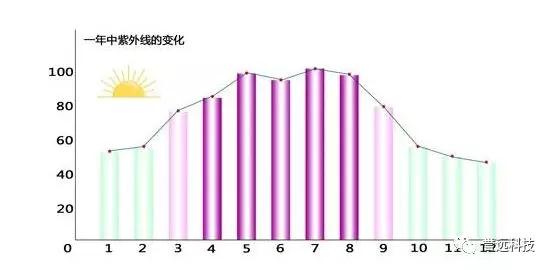 但夏天不行啊,一年中,紫外线辐射强度是从5月中旬开始明显增强,6月下旬至8月达到最大,10月份后逐渐减弱。夏天是太阳的高度角最大的季节,因此紫外线辐射明显高于其他季节。