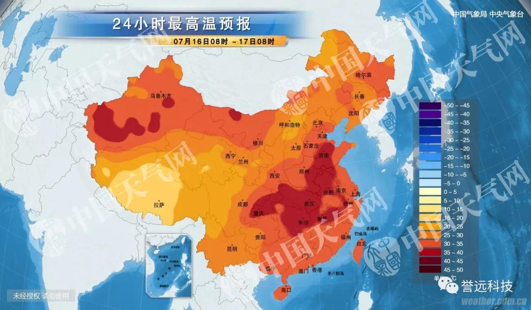 预计16日白天,华北东南部、黄淮、江淮、江汉、江南大部、四川东部、重庆、陕西关中地区、内蒙古西部、新疆吐鲁番盆地和南疆盆地等地最高气温35~36℃。