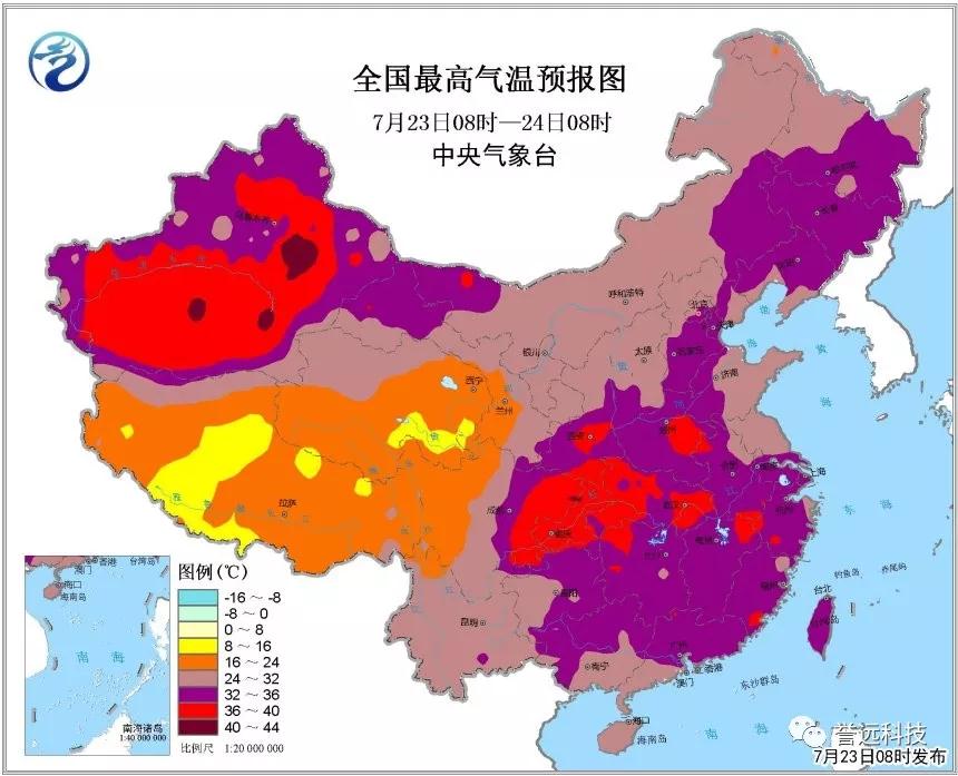 预计7月23日白天,陕西中南部、山西西南部、内蒙古西部和东南部、黄淮西部、江淮西部、江汉、江南大部、华南北部、四川盆地中东部、重庆、贵州北部、新疆中南部等地最高气温35~36℃,其中,陕西中南部、山东西南部、河南东部、湖北西部和东部、湖南西北部、江西东北部、四川东部、重庆、福建南部、新疆南疆盆地等地的部分地区最高气温37~39℃,局地可达40℃。