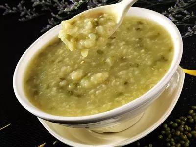 做法:绿豆用水泡发后,另用水将绿豆煮开花,制成绿豆汤;粳米煮成稠粥,半熟时加入绿豆汤、冰糖,搅拌均匀,一起煮开;粥熟后,取荷叶1张,趁热盖在粥面上,待粥变凉并呈淡绿色,即可食用。
