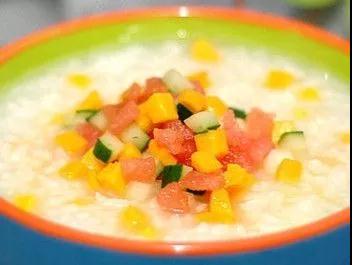 做法:将各式水果取汁或捣成泥状加入煮开的米粥里,再加入冰糖,制熟晾凉食用。